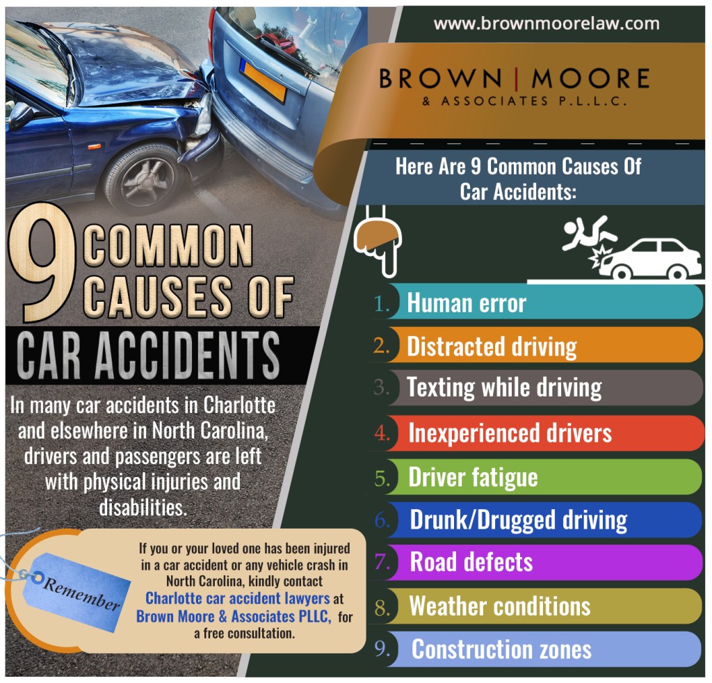Many car accidents in Charlotte and elsewhere in North Carolina, drivers and passengers are left with physical injuries and disabilities, while more than 1,400 people die in car crashes in the state each year, as reported by the North Carolina Division of Motor Vehicles (NCDMV). Car accident victims in North Carolina have to deal with mounting medical bills, property damages, emotional distress, pain and suffering, and a plethora of other consequences of car crashes. If you or your loved one has been injured in a car accident or any vehicle crash in North Carolina, kindly contact Charlotte car accident lawyers at Brown Moore & Associates PLLC, for a free consultation.