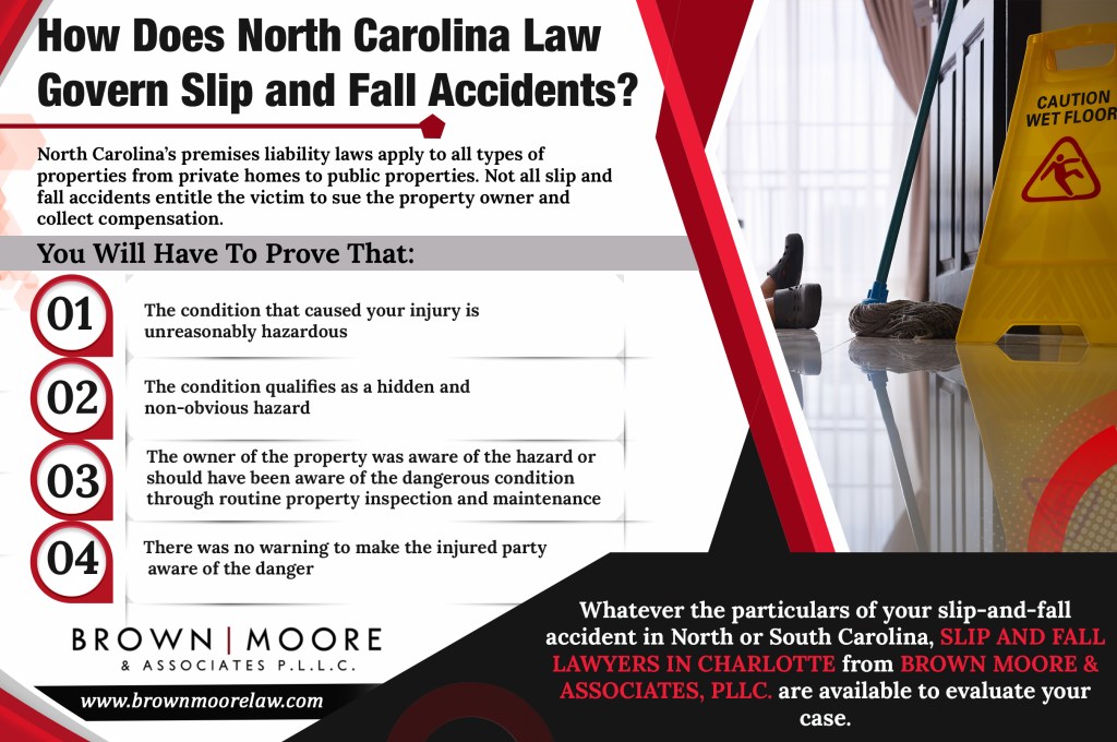 North Carolina’s premises liability laws apply to all types of properties from private homes to public properties. Not all slip and fall accidents entitle the victim to sue the property owner and collect compensation. A property owner’s failure to remedy or correct hazardous conditions can lead to traumatic brain injuries, spinal cord injuries, fractured bones, or other injuries suffered by customers and guests. Whatever the particulars of your slip-and-fall accident in North or South Carolina, slip and fall lawyers in Charlotte from Brown Moore & Associates, PLLC. are available to evaluate your case.