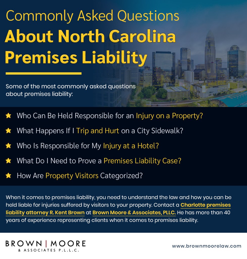 There are some of those questions and the answers that you’re looking for Premises Liability . When it comes to premises liability, you need to understand the law and how you can be held liable for injuries suffered by visitors to your property. Contact a premises liability attorney in Charlotte R. Kent Brown at Brown Moore & Associates, PLLC. He has more than 40 years of experience representing clients when it comes to premises liability.